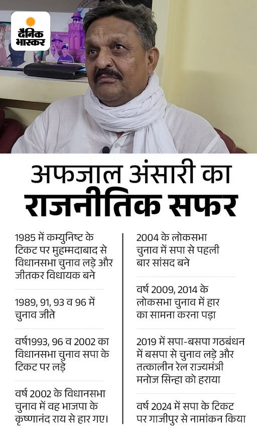 अफजाल ने 2024 के लोकसभा चुनाव में सपा के टिकट पर उतरे और गाजीपुर सीट से जीत दर्ज की।