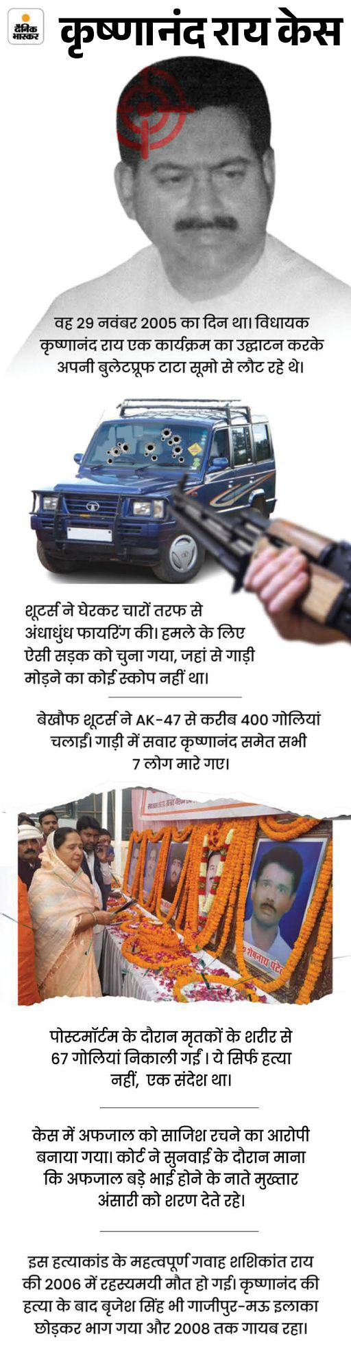 2005 में तत्कालीन भाजपा विधायक कृष्णानंद राय की हत्या के बाद अफजाल पर गैंगस्टर एक्ट लगा था। गाजीपुर की MP-MLA कोर्ट ने 29 अप्रैल, 2023 को अफजाल को गैंगस्टर एक्ट के मामले में दोषी करार दिया। 4 साल की जेल और एक लाख रुपए का जुर्माना भी लगाया था।