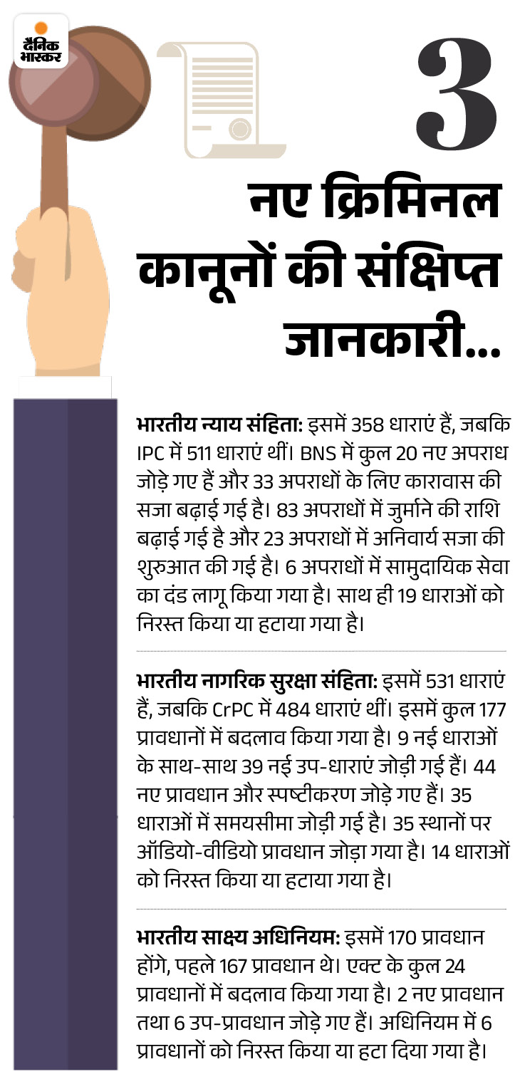 3 नए कानून: तीन नए आपराधिक कानून लागू होने के बाद FIR दर्ज होने की तारीख से तीन साल के भीतर लोगों को सुप्रीम कोर्ट स्तर से न्याय मिल सकेगा। नए कानूनों में टेक्नोलॉजी के सभी सिस्टम शामिल किए गए हैं। सुनिश्चित किया गया है कि टेक्नोलॉजी चाहे जितनी भी बदल जाए कानून में बदलाव करने की जरूरत नहीं पड़ेगी।
