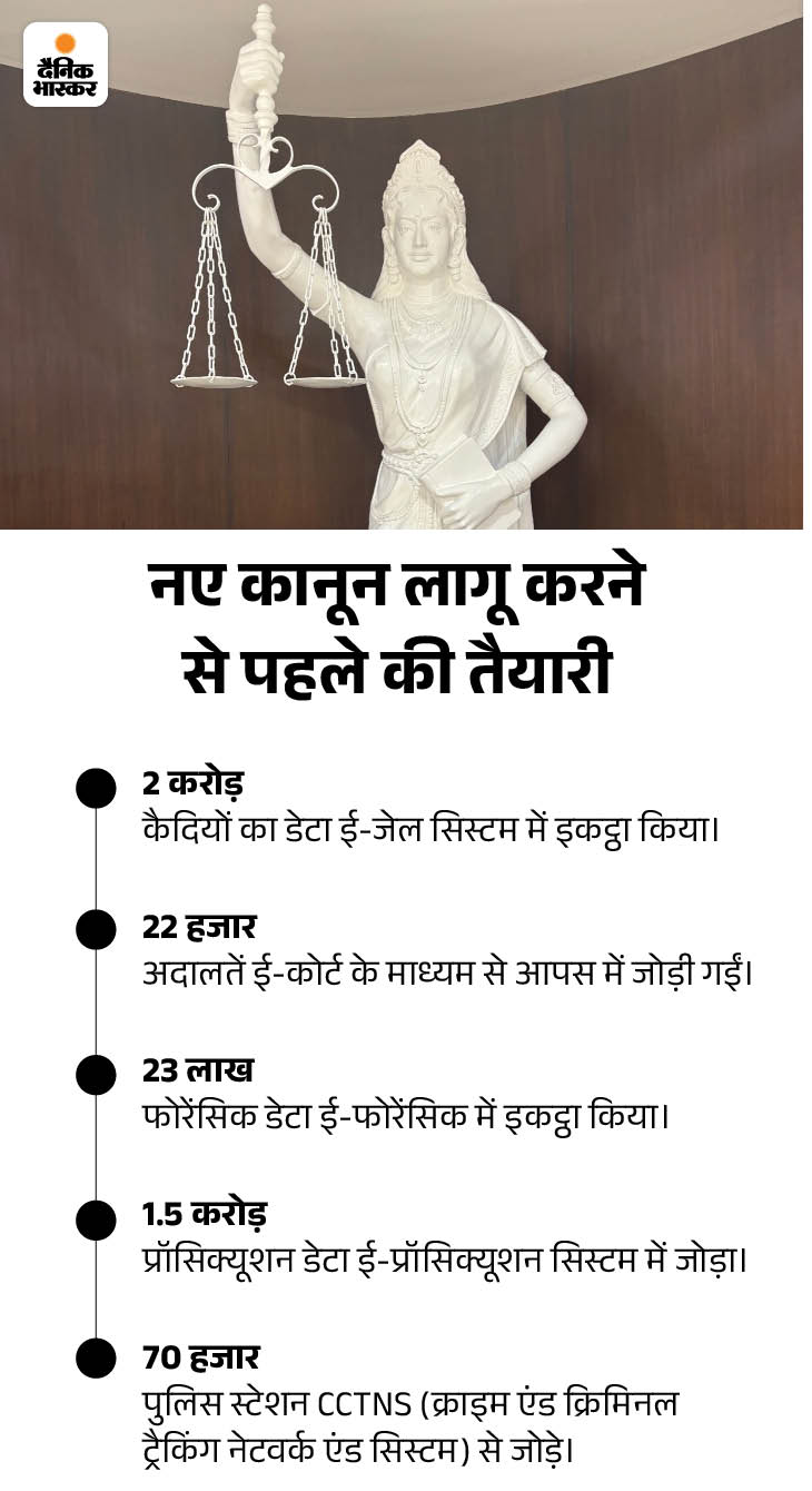 न्याय व्यवस्था: गृह मंत्रालय ने तीनों कानून लागू करने से पहले व्यापक तैयारी की थी। हमने कोर्ट, प्रॉसिक्यूशन (वादी पक्ष), पुलिस और जेल को जोड़ने की व्यवस्था की। एक तरह से अपराध से लेकर न्याय मिलने और जेल तक सभी कड़ियों को जोड़ने का काम किया।