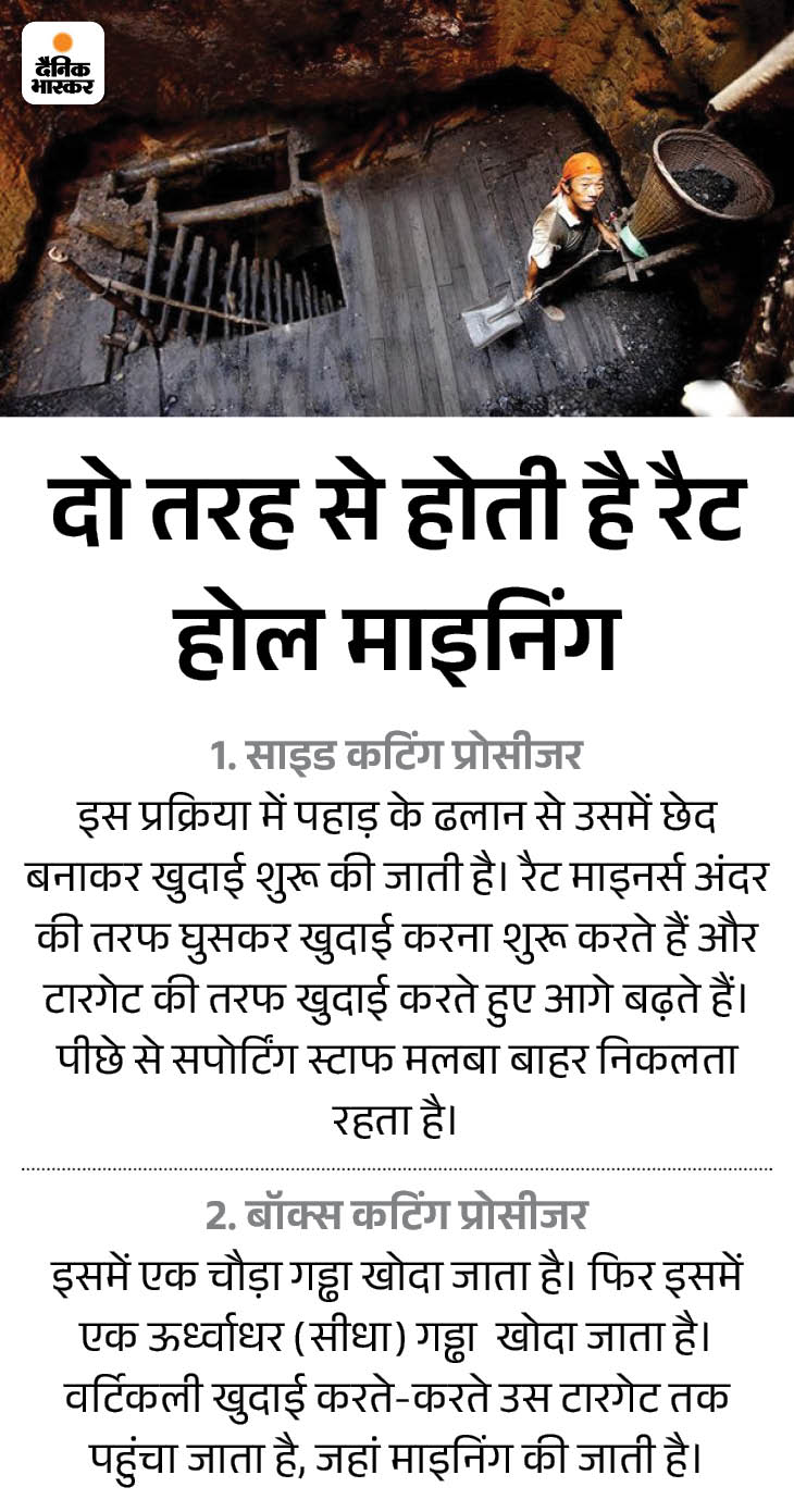 रैट माइनिंग पर 2014 में NGT ने लगाया था बैन रैट माइनिंग कोयला खदानों में काम करने वाले मजदूरों ने ईजाद की थी। नेशनल ग्रीन ट्रिब्यूनल, यानी NGT ने 2014 में इस पर बैन लगा दिया था। एक्सपर्ट्स ने इसे अवैज्ञानिक तरीका बताया था। हालांकि, विशेष परिस्थितियों, यानी रेस्क्यू ऑपरेशन में रैट माइनिंग पर प्रतिबंध नहीं है।
