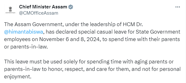 मुख्यमंत्री कार्यालय ने X पर पोस्ट किया, ‘सीएम हिमंता बिस्व सरमा के नेतृत्व में असम सरकार ने राज्य सरकार के कर्मचारियों को अपने माता-पिता या सास-ससुर के साथ समय बिताने के लिए 6 और 8 नवंबर, 2024 को विशेष आकस्मिक अवकाश की घोषणा की है।’