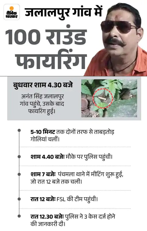 बुधवार शाम चलीं थी 100 राउंड गोलियां बुधवार शाम पूर्व विधायक और बाहुबली नेता अनंत सिंह अपने समर्थकों के साथ नौरंगा गांव पहुंचे थे। वहां गैंगस्टर सोनू-मोनू और अनंत समर्थकों के बीच फायरिंग हुई थी। इस दौरान 100 राउंड फायरिंग होने की बात कही जा रही थी।