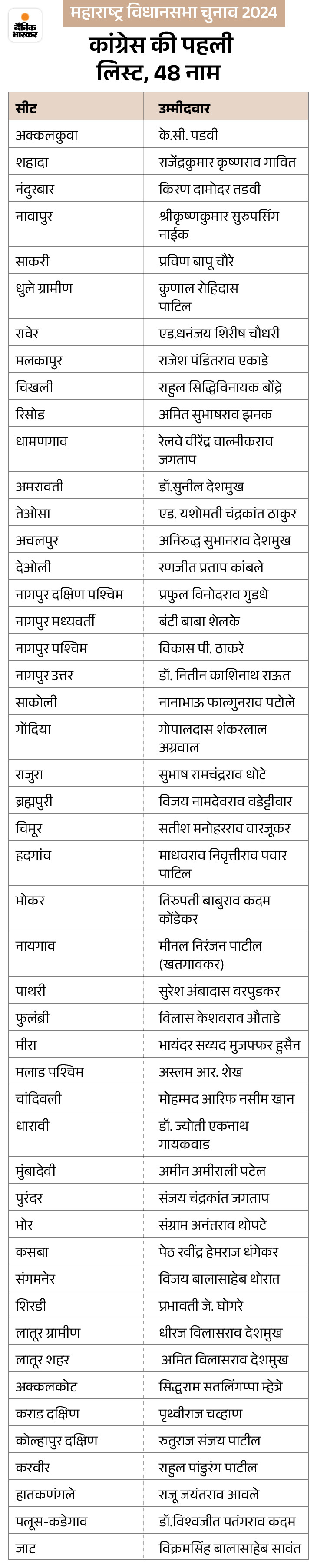 कांग्रेस के महाराष्ट्र अध्यक्ष नाना पटोले को साकोली सीट से टिकट दिया गया है। पृथ्वीराज चव्हाण को कराड साउथ सीट से उम्मीदवार हैं। अमरावती से सुनील देशमुख को उतारा गया है। कांग्रेस की पहली लिस्ट में 5 महिला प्रत्याशियों को टिकट दिया गया है। 5 ST और 3 SC उम्मीदवार हैं।