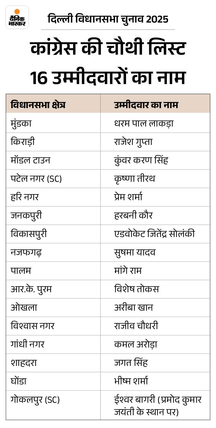 दिल्ली विधानसभा चुनाव के लिए मंगलवार रात कांग्रेस ने 16 कैंडिडेट की चौथी लिस्ट जारी की है। इस लिस्ट में 4 महिलाओं और 2 SC कैंडिडेट के नाम हैं। अब तक पार्टी 63 नामों का ऐलान कर चुकी है। अब 7 सीटों पर कैंडिडेट का ऐलान बाकी है।