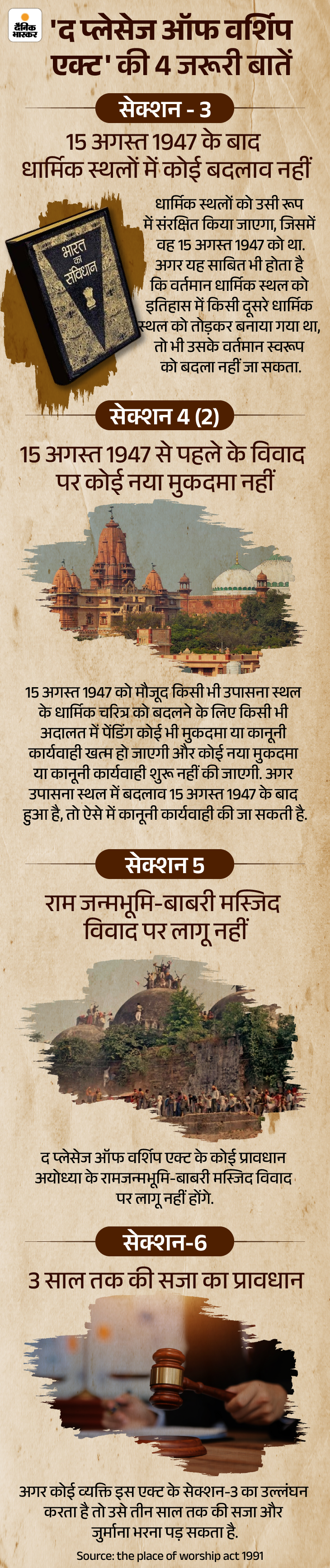 दरअसल, यह एक्ट किसी धार्मिक स्थल के स्वरूप को बदलने पर रोक लगाता है। इसके अनुसार स्थल को उसी रूप में संरक्षित किया जाएगा, जिसमें वह 15 अगस्त, 1947 को था। अगर यह भी साबित हो जाता है कि उसे किसी दूसरे धर्म के उपासना स्थल को तोड़कर बनाया गया है तो भी उसके स्वरूप को बदला नहीं जा सकता।