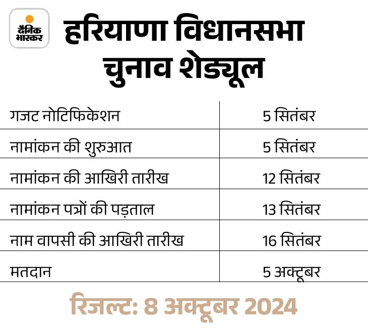 राज्य में 90 विधानसभा सीटों के लिए सिंगल फेज में 5 अक्टूबर को वोटिंग होगी। 8 अक्टूबर को रिजल्ट आएगा।