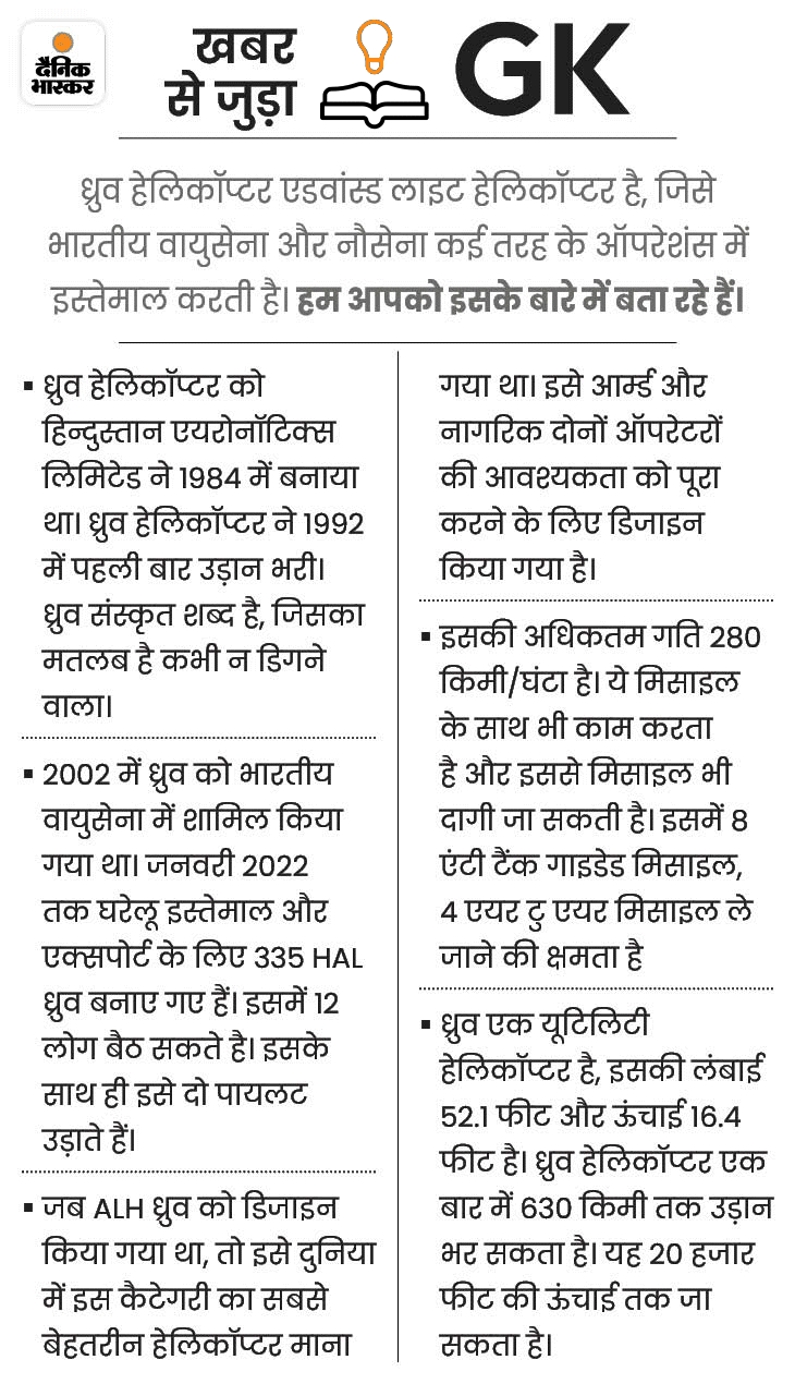 क्रैश हेलिकॉप्टर एडवांस्ड लाइट हेलिकॉप्टर ध्रुव हैै। इसका इस्तेमाल रेस्क्यू और पेट्रोलिंग में होता है।
