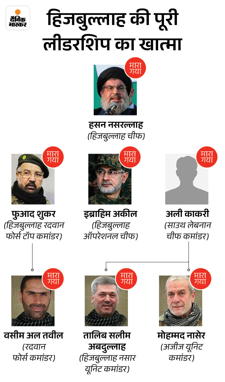 इजराइल ने 2 महीने में हिजबुल्लाह की पूरी लीडरशिप खत्म की इजराइल ने 2 महीने के भीतर हिजबुल्लाह की पूरी लीडरशिप को खत्म कर दिया है। 27 सितंबर को हिजबुल्लाह के हेडक्वार्टर पर 80 टन बम से हमला किया था। इसमें चीफ हसन नसरल्लाह मारा गया। 30 जुलाई को लेबनान पर एक एयरस्ट्राइक में हिजबुल्लाह के दूसरे सबसे सीनियर लीडर फुआद शुकर को मार गिराया था।