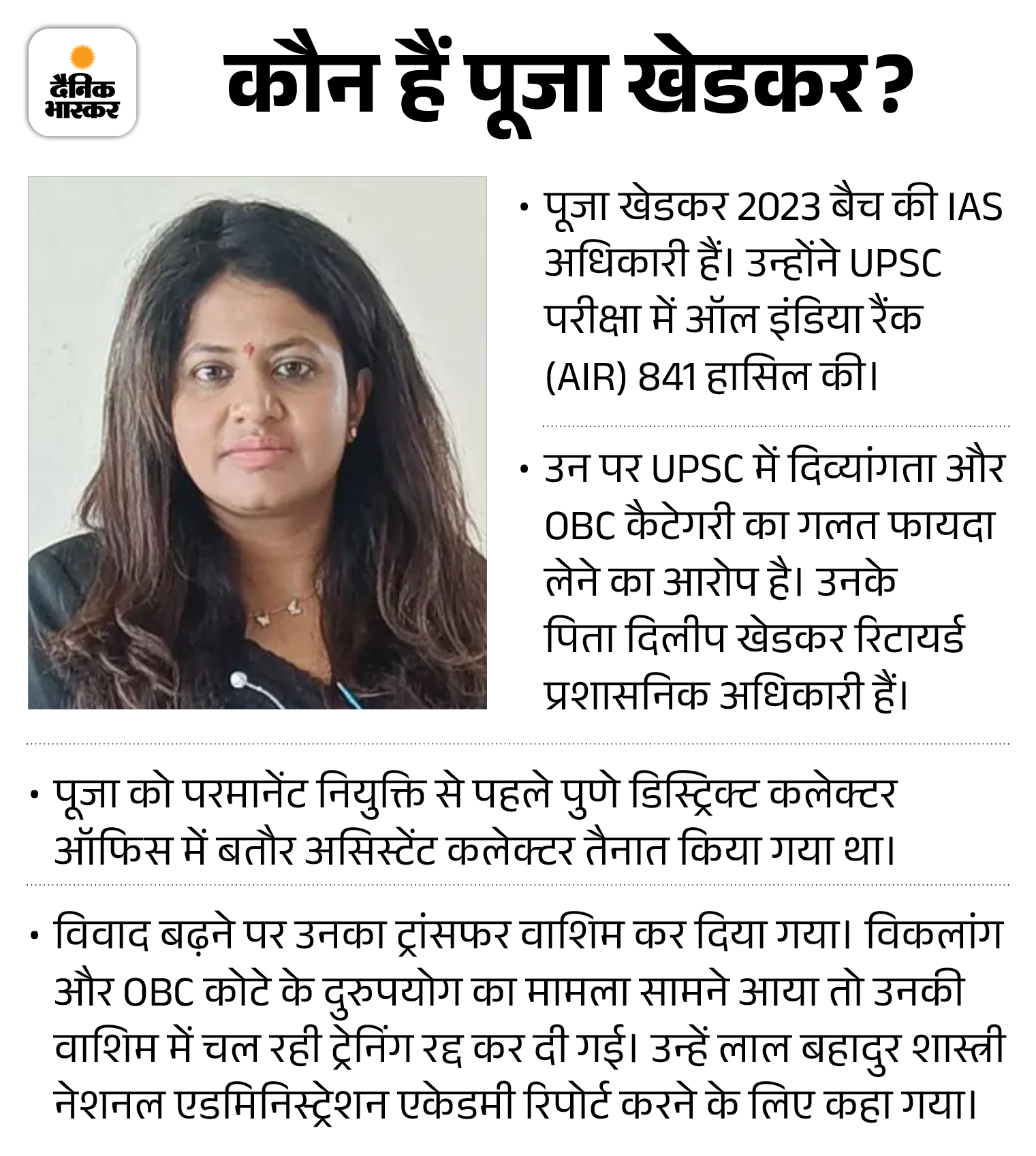 पूजा खेडकर के खिलाफ UPSC ने FIR दर्ज कराई है। UPSC ने आरोप लगाया है कि पूजा ने अपनी पहचान बदल-बदलकर UPSC की तय सीमा से ज्यादा बार सिविल सर्विसेस का एग्जाम दिया। दिल्ली पुलिस की क्राइम ब्रांच ने पूजा के खिलाफ जालसाजी, धोखाधड़ी, IT एक्ट और डिसेबिलिटी एक्ट के तहत केस दर्ज किया है।