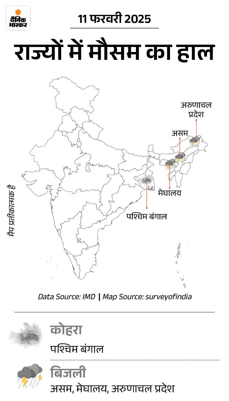 मौसम विभाग ने आज केवल पश्चिम बंगाल में घने कोहरे की संभावना जताई है। इसके अलावा असम, मेघालय और अरुणाचल प्रदेश में बिजली, गरज और बारिश का अनुमान है।