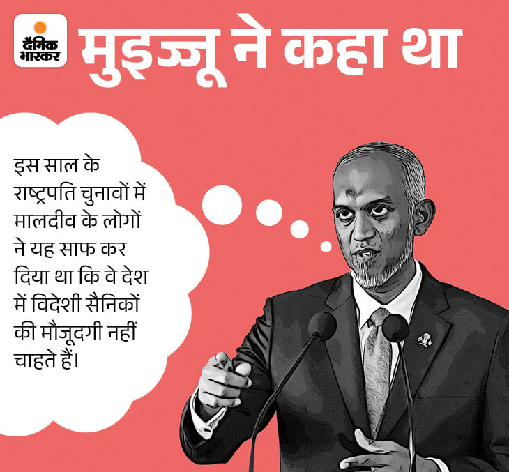 मुइज्जू ने कहा था कि अगर भारत अपनी सेना को नहीं हटाएगा तो यह मालदीव के लोगों की लोकतांत्रिक आजादी का अपमान होगा। मुइज्जू ने भारतीय सैनिकों की मौजूदगी को मालदीव में लोकतंत्र के भविष्य के लिए खतरा भी बताया था। उन्होंने कहा कि देश में बिना संसद की इजाजत के दूसरे देश की सेना की उपस्थिति संविधान के खिलाफ है।