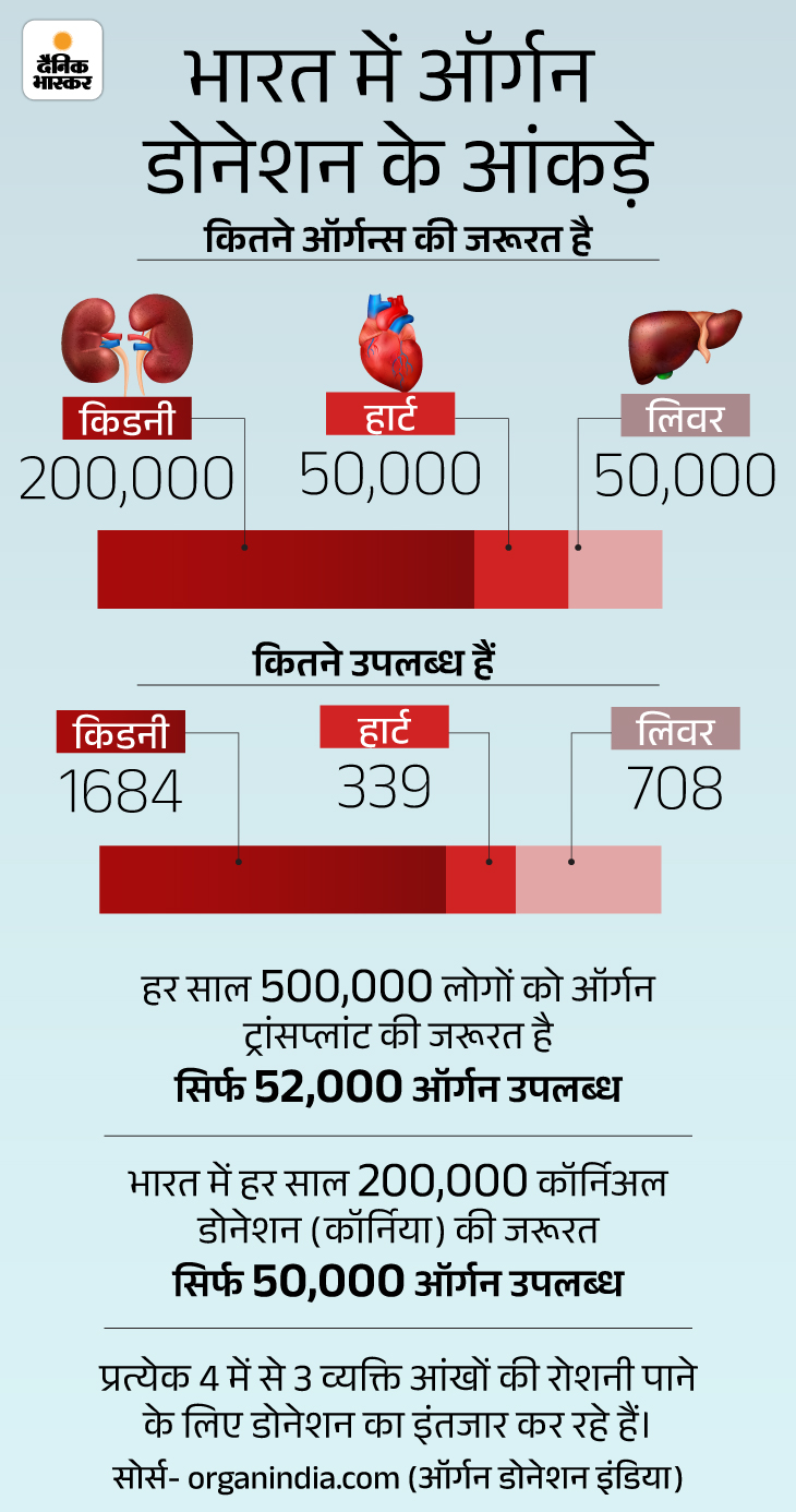ऑर्गन डोनेशन इंडिया के आंकड़ों के मुताबिक, भारत में हर साल 500,000 लोगों को ऑर्गन ट्रांसप्लांट की जरूरत है, जबकि सिर्फ 52,000 ऑर्गन उपलब्ध हैं। हर साल 200,000 कॉर्निअल डोनेशन की जरूरत है ताकि नेत्रहीनों के जीवन में उजाला हो सके, लेकिन उपलब्ध सिर्फ 50,000 हैं। प्रत्येक 4 में से 3 व्यक्ति आंखों की रोशनी पाने के लिए डोनेशन का इंतजार करता है।