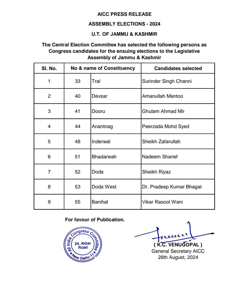 जम्मू-कश्मीर विधानसभा चुनाव में कांग्रेस और नेशनल कांफ्रेंस साथ मिलकर चुनाव लड़ रही हैं। कांग्रेस ने सोमवार देर रात 9 कैंडीडेट की पहली लिस्ट जारी कर दी। वहीं नेशनल कांफ्रेंस ने भी 19 उम्मीदवारों का ऐलान कर दिया है।