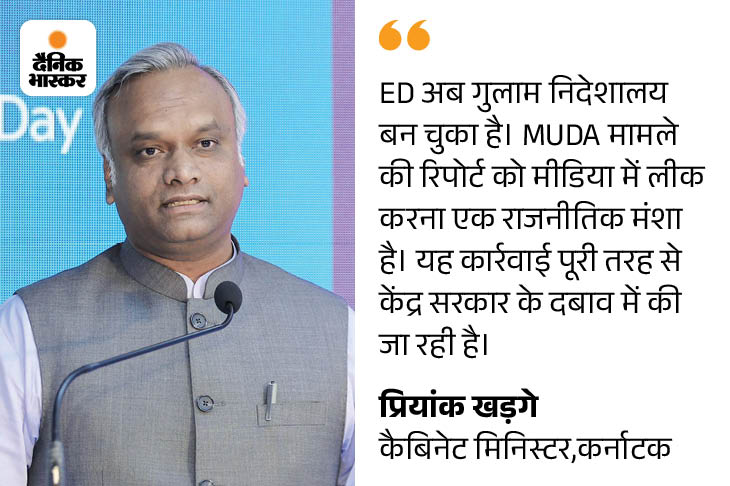 कर्नाटक के मंत्री प्रियांक खड़गे ने गुरुवार को ED को ‘गुलाम निदेशालय’ बताया। प्रियांक ने सोशल मीडिया X पर लिखा, ‘प्रवर्तन निदेशालय (ED) एक गुलाम निदेशालय बन गया है। वे भाजपा सरकार की असहाय और लाचार कठपुतलियों के अलावा कुछ नहीं हैं। मैसूर अर्बन डेवलपमेंट अथॉरिटी (MUDA) मामले में CM सिद्धारमैया के खिलाफ ED की जो रिपोर्ट लीक की गई है, वह पूरी तरह से मनगढ़ंत है।’