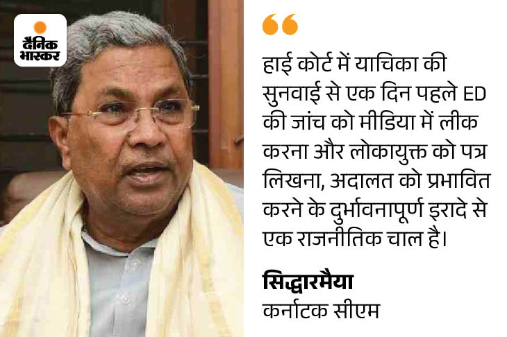 कर्नाटक के मुख्यमंत्री सिद्धारमैया ने जांच एजेंसी पर लगाए आरोप बुधवार को कर्नाटक के मुख्यमंत्री सिद्धारमैया ने हाईकोर्ट में याचिका की सुनवाई से पहले लोकायुक्त को पत्र लिखने पर कहा कि ED अदालत को प्रभावित करना चाहता था।