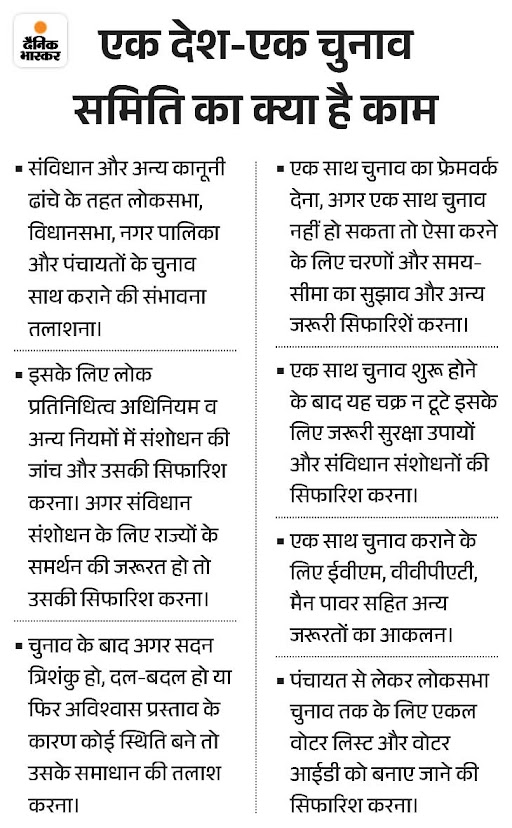 केंद्र सरकार ने वन नेशन – वन इलेक्शन के लिए 8 सदस्यीय एक कमेटी बनाई है। जिसके अध्यक्ष पूर्व राष्ट्रपति रामनाथ कोविंद हैं। 23 सितंबर को कमेटी की पहली बैठक दिल्ली के जोधपुर ऑफिसर्स हॉस्टल में हुई थी। इसमें फैसला लिया गया कि एक साथ चुनाव के मुद्दे पर मान्यता प्राप्त राष्ट्रीय और क्षेत्रीय दलों के विचार लिए जाएंगे। इस मुद्दे पर सुझाव देने के लिए लॉ कमीशन को भी बुलाया जाएगा।