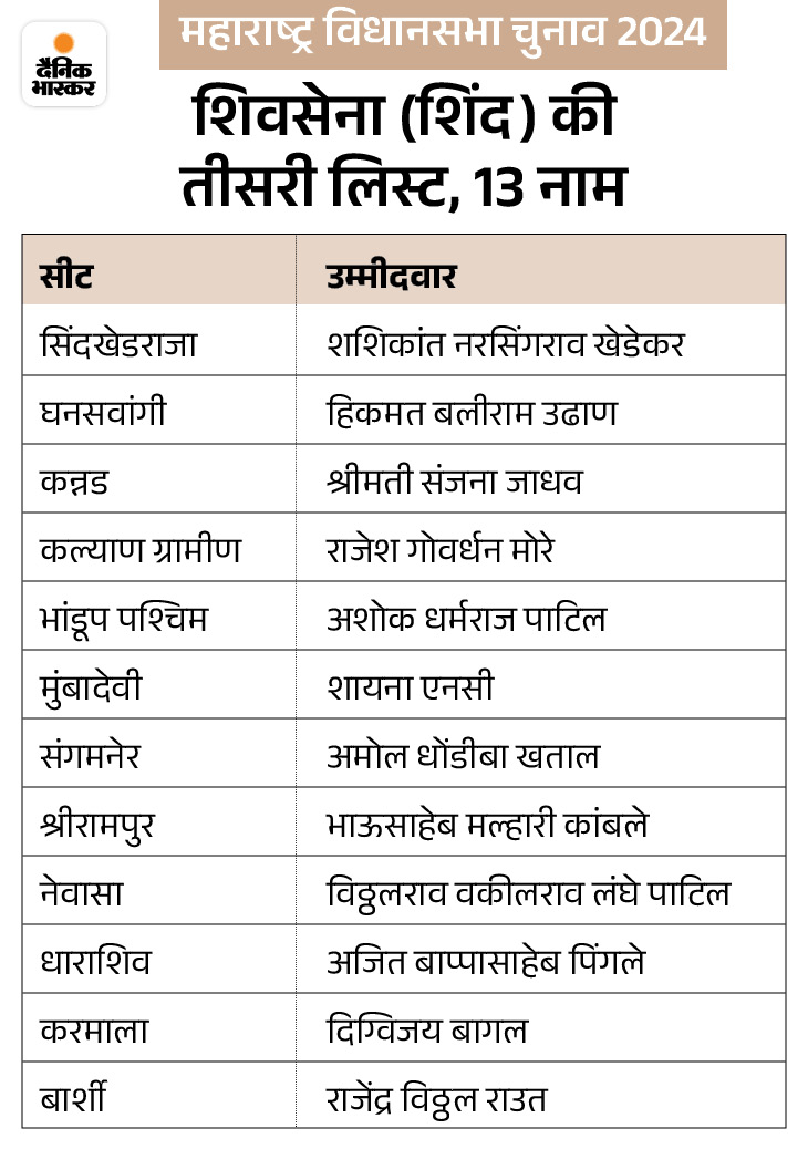 Maharashtra Assembly election update Shiv Sena Shinde third list update 13 names | महाराष्ट्र चुनाव, शिवसेना शिंदे की तीसरी लिस्ट में 13 नाम: अब तक 88 प्रत्याशियों का ऐलान, BJP की शाइना को मुंबादेवी से टिकट दिया