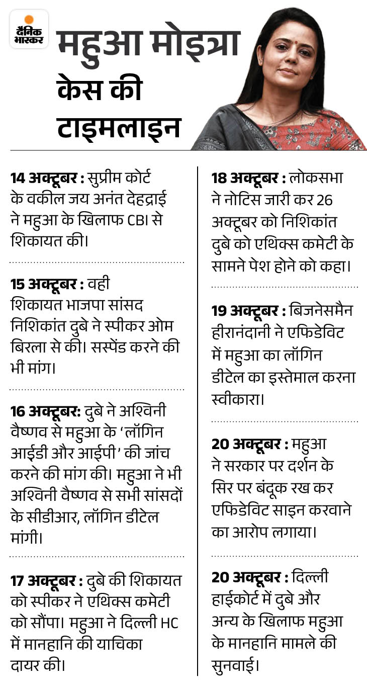 भाजपा सांसद निशिकांत दुबे ने 15 अक्टूबर को लोकसभा स्पीकर ओम बिड़ला को चिट्ठी लिखी थी। इसमें उन्होंने महुआ पर आरोप लगाए थे कि महुआ ने संसद में सवाल पूछने के लिए बिजनेसमैन दर्शन हीरानंदानी से पैसे और तोहफे लिए थे। इस मामले को स्पीकर ने एथिक्स कमेटी को भेज दिया।