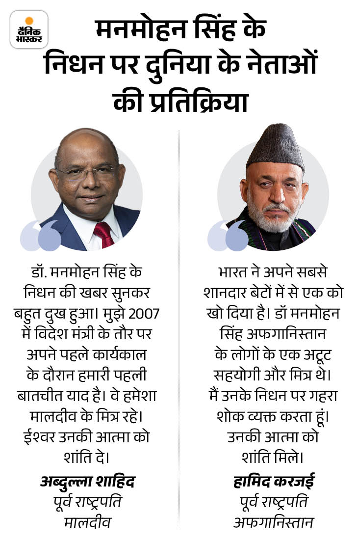 पूर्व PM के निधन पर वर्ल्ड मीडिया का रिएक्शन मनमोहन सिंह के निधन पर वर्ल्ड मीडिया में भी कई आर्टिकल पब्लिश हुए हैं। अमेरिकी अखबार न्यूयॉर्क टाइम्स ने उन्हें मृदुभाषी और बुद्धिजीवी बताया है। वहीं वॉशिंगटन पोस्ट ने भी पूर्व PM के निधन पर प्रतिक्रिया दी। अखबार ने अपनी पोस्ट में उन्हें बड़े बदलाव करने वाला नेता बताया है। अखबार उनके दोनों कार्यकाल पर टिप्पणी भी की।