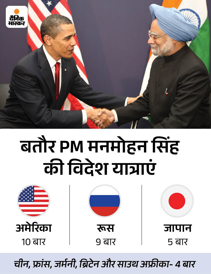 बतौर PM मनमोहन सिंह 72 विदेशी दौरे किए प्रधानमंत्री रहते हुए मनमोहन सिंह अपनी पहली विदेश यात्रा पर थाईलैंड गए थे। 29 से 31 जुलाई तक के अपने दिवसीय दौरे पर उन्होंने BIMSTEC समिट में हिस्सा लिया। अपने 10 साल के कार्यकाल में PM मनमोहन सिंह ने लगभग 72 विदेश यात्राएं की थी। इनमें सबसे ज्यादा बार उन्होंने अमेरिका का दौरा किया था। कुछ प्रमुख देशों में उनकी यात्राएं…