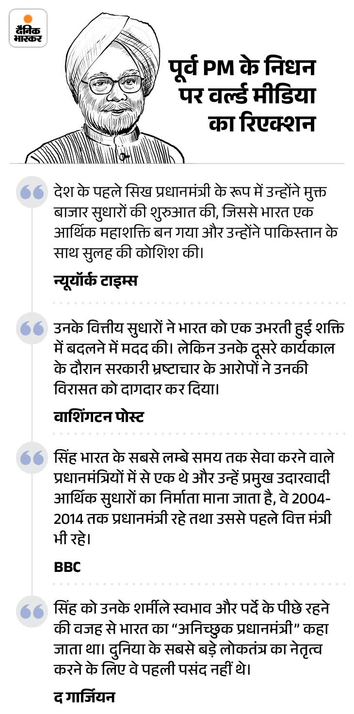 BBC ने पूर्व PM को आर्थिक सुधार का प्रणेता बताया। इसके अलावा अंग्रेजी अखबार द गार्जियन ने अपने आर्टिकल में मनमोहन सिंह को अनिच्छुक प्रधानमंत्री कहा।