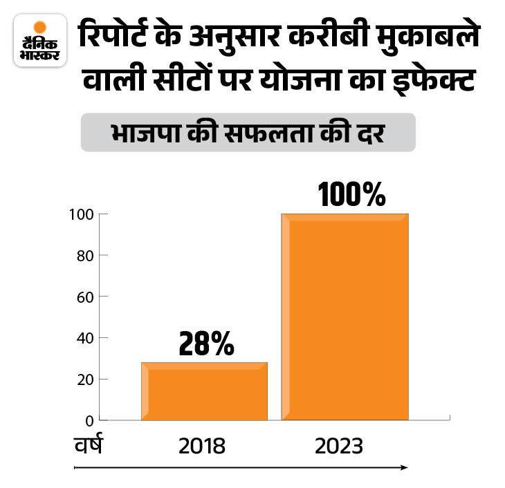 इस रिपोर्ट के अनुसार लाड़ली बहना के कारण मध्यप्रदेश में हर आठवीं सीट पर भाजपा ने जीत दर्ज की जहां उसके हारने के चांस थे। सही भी है, लाड़ली बहना की तर्ज़ पर ही भाजपा आख़िरी के दिनों में छत्तीसगढ़ में महतारी योजना लाई थी जिसके कारण जो गाँव कांग्रेस के पक्ष में दिख रहे थे, वे भाजपा के पक्ष में हो गए।