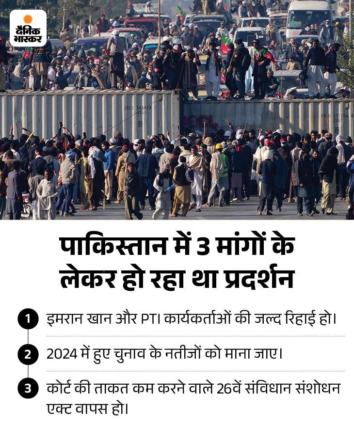 पाकिस्तान में इमरान खान की रिहाई को लेकर 24 नवंबर को विरोध प्रदर्शन शुरू हुआ था। 3 दिनों में हुए विरोध प्रदर्शन में कम से कम 7 लोगों की जान चली गई। इनमें 4 प्रदर्शनकारी और 3 पुलिसकर्मी शामिल हैं। सुरक्षाकर्मियों ने 500 से ज्यादा प्रदर्शनकारियों को गिरफ्तार भी किया है।