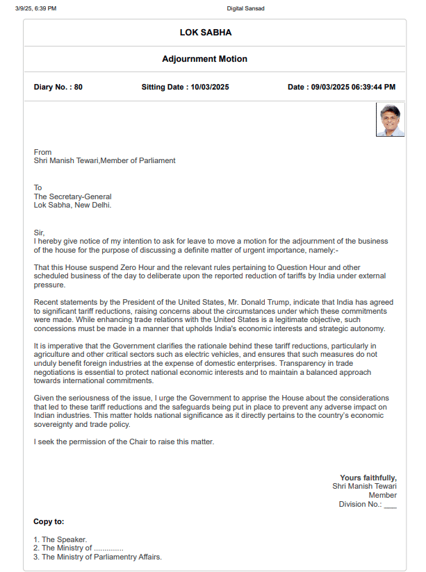 कांग्रेस सांसद मनीष तिवारी ने बाहरी दबाव के चलते भारत की तरफ से टैरिफ में कथित कटौती पर चर्चा के लिए लोकसभा में कार्यस्थगन प्रस्ताव दिया।
