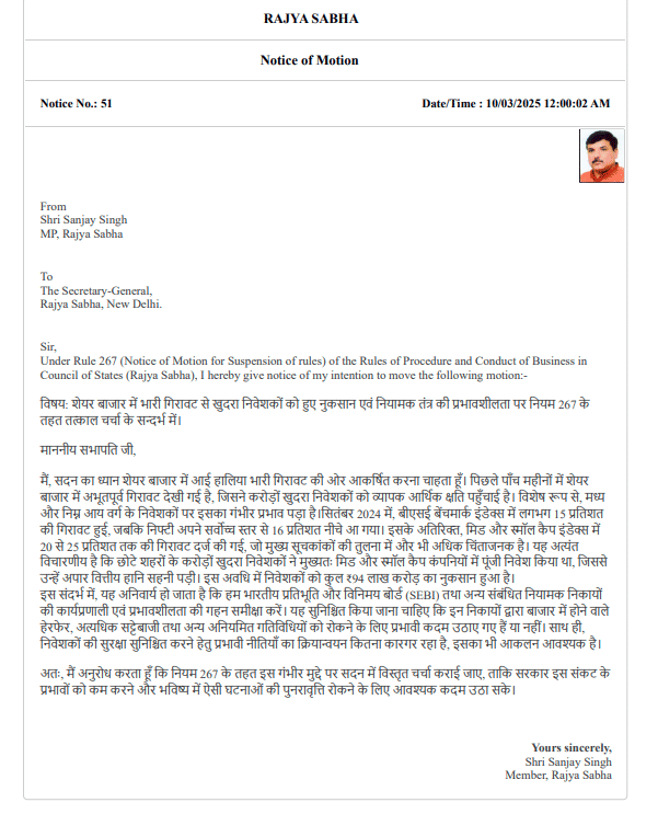 आप सांसद संजय सिंह ने राज्यसभा में नियम 267 के तहत कार्य स्थगन नोटिस दिया है, जिसमें “शेयर बाजार में तीव्र गिरावट के कारण खुदरा निवेशकों को हुए नुकसान और नियामक तंत्र की प्रभावशीलता” पर चर्चा की जाएगी।
