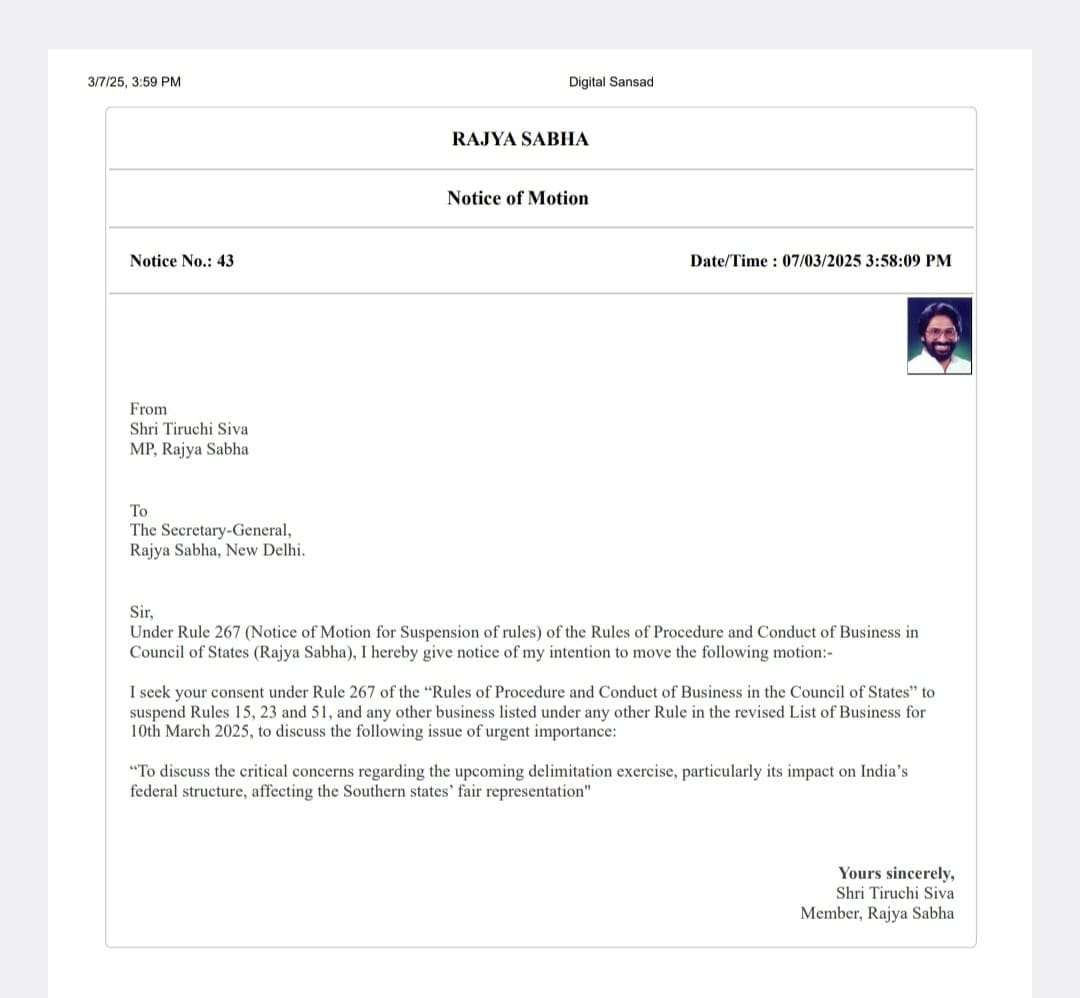 डीएमके सांसद तिरुचि शिवा ने नियम 267 के तहत राज्यसभा में कार्य स्थगन नोटिस दिया, जिसमें “आगामी परिसीमन प्रक्रिया से संबंधित गंभीर चिंताओं, विशेष रूप से भारत के संघीय ढांचे पर इसके प्रभाव, जो दक्षिणी राज्यों के निष्पक्ष प्रतिनिधित्व को प्रभावित कर रहा है” पर चर्चा की गई।