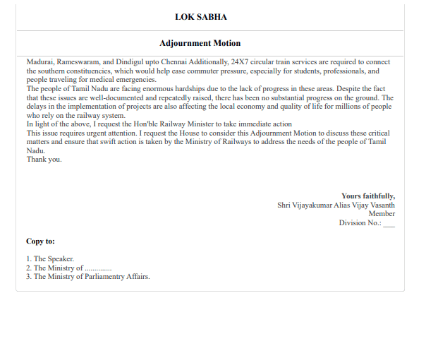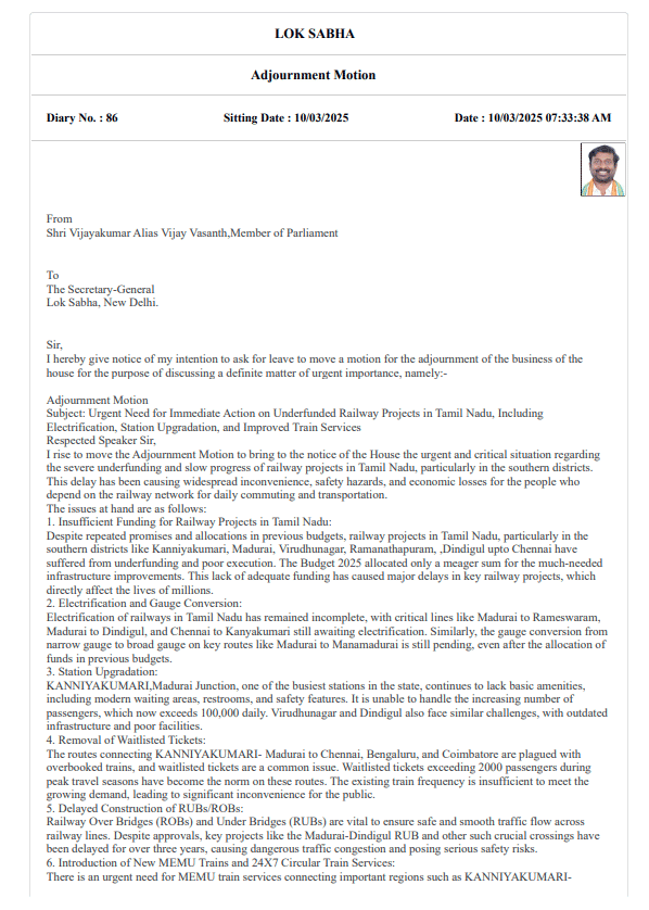 कन्याकुमारी से लोकसभा सांसद विजय कुमार उर्फ विजय वसंत ने सदन में एक स्थगन प्रस्ताव पेश किया है, जिसमें “तमिलनाडु में अपर्याप्त वित्तपोषित रेलवे परियोजनाओं पर तत्काल कार्रवाई की आवश्यकता” पर तत्काल चर्चा की मांग की गई है।