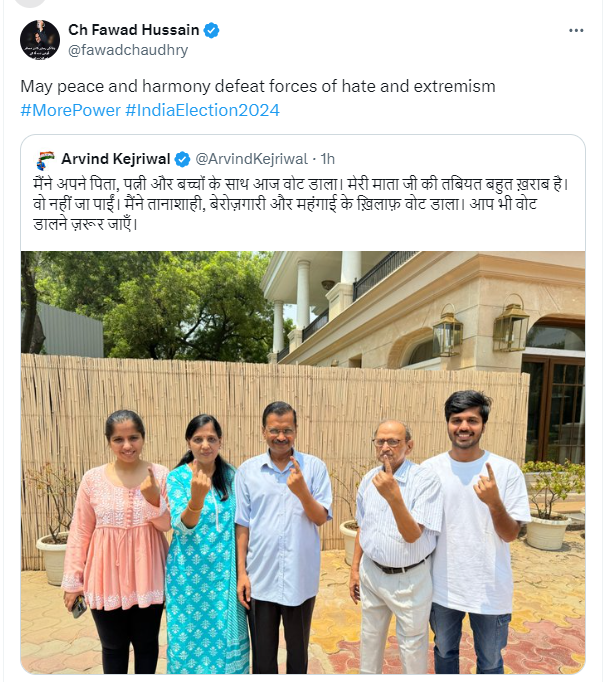 लोकसभा चुनाव के छठे फेज (25 मई) की वोटिंग के दौरान दिल्ली के CM अरविंद केजरीवाल ने शनिवार 25 मई की सुबह अपने परिवार के साथ दिल्ली में वोट डाला, जिसकी तस्वीर उन्होंने सोशल मीडिया पर पोस्ट की। केजरीवाल की तस्वीर को फिर से पोस्ट करते हुए पाकिस्तान के पूर्व मंत्री फवाद चौधरी ने लिखा- मैं कामना करता हूं कि शांति और सद्भाव से नफरत और उग्रवाद की ताकतों की हार होगी।