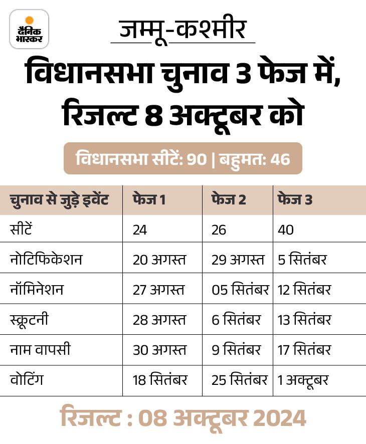 जम्मू-कश्मीर में 10 साल बाद विधानसभा चुनाव होने वाले हैं। 2019 में आर्टिकल-370 हटाने के बाद यह पहला विधानसभा चुनाव है। जम्मू और कश्मीर में 90 विधानसभा क्षेत्र हैं, जिनमें 7 अनुसूचित जातियों के लिए और 9 अनुसूचित जनजातियों के लिए रिजर्व हैं।