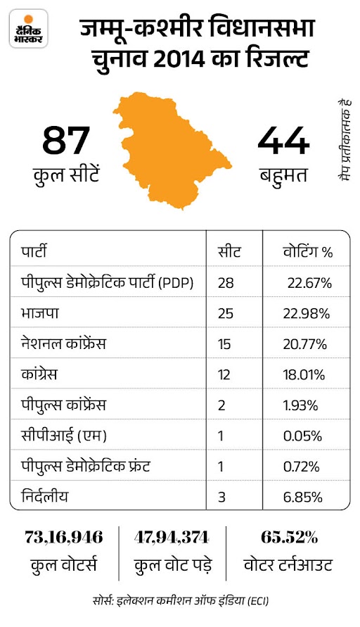 2014 के विधानसभा चुनाव में भाजपा ने 25 सीटों पर जीत दर्ज की थी। पीपुल्स डेमोक्रेटिक पार्टी (PDP) ने 28 सीटें, जम्मू और कश्मीर नेशनल कॉन्फ्रेंस (NC) ने 15 और कांग्रेस ने 12 सीटें जीती थीं।