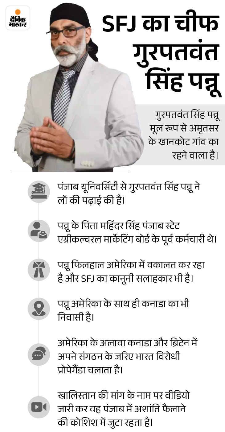 भारत सरकार ने 2019 में आतंकी गतिविधियां चलाने के आरोप में गैरकानूनी गतिविधि रोकथाम अधिनियम यानी UAPA के तहत पन्नू के संगठन SFJ पर बैन लगाया। गृह मंत्रालय ने अपनी अधिसूचना में कहा था कि सिखों के लिए रेफरेंडम की आड़ में SFJ पंजाब में अलगाववाद और उग्रवादी विचारधारा का समर्थन कर रहा है।