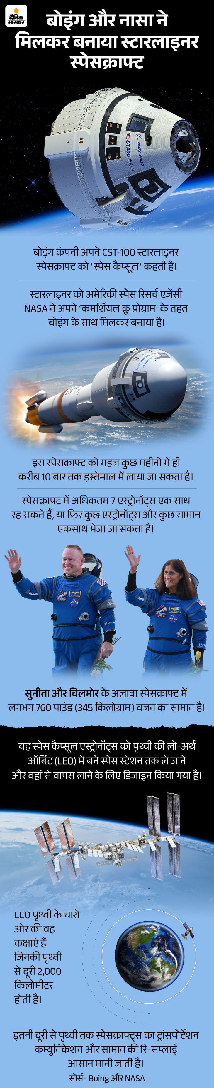 बोइंग कंपनी ने NASA के लिए यह स्पेसक्राफ्ट बनाया है। 5 जून को सुनीता और बुच को इससे ISS पर भेजा गया था। यह सिर्फ 8 दिन का मिशन था, लेकिन इसके सुरक्षित लौटने पर कई तरह की आशंकाएं थीं।