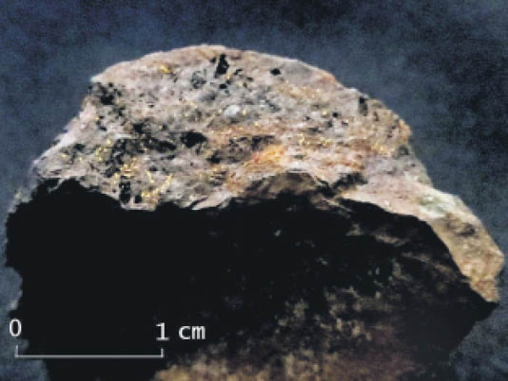 यह तस्वीर उस पत्थर की है जो जमीनी सतह से 5 फीट नीचे से मिला था। भारतीय भूवैज्ञानिक सर्वेक्षण (जीएसआई) ने करीब 3 इंच के इस पत्थर को संभाल कर रखा है। घुप्प अंधेरे में इस पत्थर का फाेटाे लेकर दर्शाया कि साेने के कण व अन्य धातु इसमें चमक बिखेर रहे हैं।