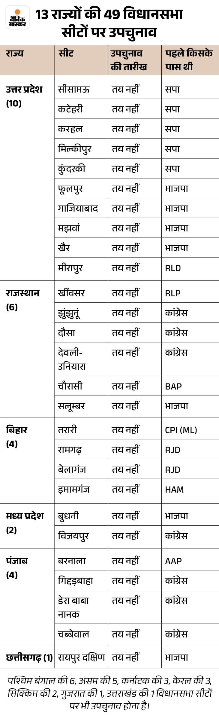 वहीं उत्तर प्रदेश की 10, राजस्थान की 7, पश्चिम बंगाल की 6, असम की 5, बिहार की 4, पंजाब की 4, कर्नाटक की 3, केरल की 3, मध्य प्रदेश की 2, सिक्किम की 2, गुजरात की 1, उत्तराखंड की 1 और छत्तीसगढ़ की 1 विधानसभा सीटों पर भी उपचुनाव होना है।