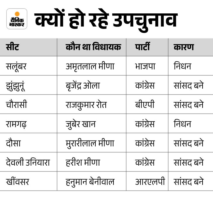 साल 2023 में हुए विधानसभा चुनाव के 11 महीने के भीतर ही इन सीटों पर फिर इलेक्शन होंगे। इनमें से 5 सीट विधायकों के सांसद बनने के कारण और दो सीटें विधायकों के निधन के कारण खाली हैं।