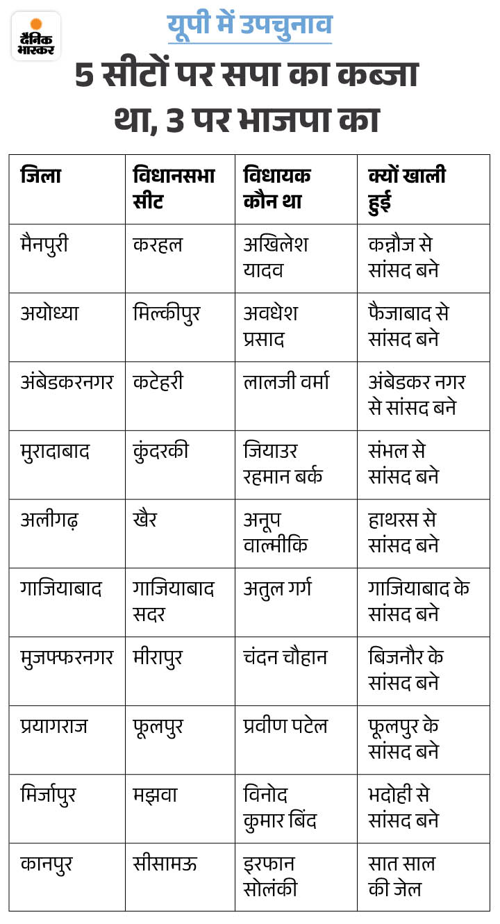 जिन 10 सीटों पर उपचुनाव होने हैं, उनमें अयोध्या की मिल्कीपुर, अंबेडकरनगर की कटेहरी, प्रयागराज की फूलपुर, अलीगढ़ की खैर, मिर्जापुर की मझवां, कानपुर की सीसामऊ, मैनपुरी की करहल, मुरादाबाद की कुंदरकी, गाजियाबाद और मुजफ्फरनगर की मीरापुर सीट है।4