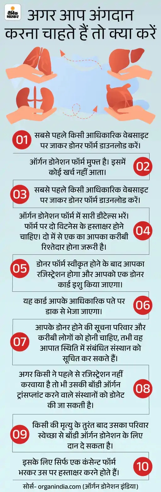 पति और बेटी ने कहा- अंगदान से बेहतर कुछ नहीं महिला के पति भूपेंद्र राठौर शिक्षक हैं, जबकि बेटी पुणे में एक आईटी कंपनी में काम करती है। दोनों का कहना है कि लगातार हो रहे अंगदान से प्रेरित होकर उन्होंने यह फैसला लिया। अंगदान से किसी को नया जीवन मिलना, इससे बेहतर कुछ नहीं हो सकता। लोगों को इसके लिए आगे आना चाहिए।