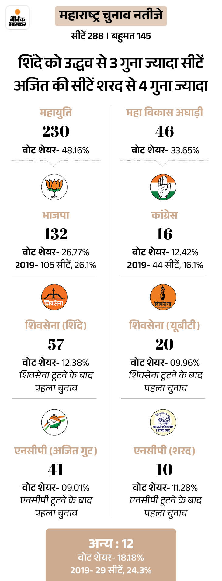 महाराष्ट्र विधानसभा चुनाव में महायुति ने बड़ी जीत हासिल की है। महायुति को 288 सीटों में से 230 सीटों पर जीत हासिल हुई है। भाजपा ने 132, शिवसेना (एकनाथ शिंदे) ने 57 और NCP (अजित पवार) ने 41 सीटें जीती हैं। वहीं, कांग्रेस के नेतृत्व वाला महा विकास अघाड़ी (MVA) 46 सीटों पर सिमट गया। पूरी खबर पढ़ें…